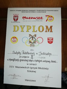 W kategorii młodzieżowej wygrała PSP Nr 158 z Warszawy - 49 pkt. przed PSP nr 10 z Ostrołęki - 42 pkt. i PSP Nr 5 z Siedlec - 41 pkt. ZSP Jedlińsk został sklasyfikowany z dorobkiem 18 pkt na miejscach 18-22 w gronie 296 szkół, których zawodnicy dotarli do zawodów wojewódzkich. W ubiegłorocznych igrzyskach na wszystkich szczeblach rozgrywek wzięło udział ponad 7000 dzieci i młodzieży. Prezes Szkolnego Związku Sportowego Warszawy i Mazowsza - Iwona Zielińska-Mróz wręczyła okolicznościowe puchary i dyplomy przedstawicielom najlepszych szkół. Trofea dla ZSP w Jedlińsku odebrali nauczyciele wychowania fizycznego Alina Cielniak, Sławomir Słomka, Radosław Ofiara i Krystian Kilar. Miłym akcentem było uhonorowanie Sławomira Słomki srebrną odznaką„Za Zasługi dla Sportu” przyznaną przez Ministra Sportu i Turystyki Kamila Bortniczuka. W uroczystości nie zabrakło części artystycznej, w której zaprezentowała się para taneczna oraz dziecięcy zespół gimnastyczny.
