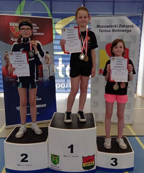 Sensacyjnie wypadli uczniowie klasy drugiej. Alicja Auguściak i Maksymilian Wydra w najmłodszej kategorii skrzatów. Oboje wystartowali po raz pierwszy w turnieju rangi mistrzostw województwa. Ala, po wygraniu trzech gier, dotarła aż do półfinału, w którym uległa turniejowej jedynce - Zofii Kałuskiej ze Spójni 1:3. W meczu o trzecią lokatę pokonała, po zaciętym meczu, Martynę Zarzycką z Lupusa Kabaty 3:2 i zdobyła brązowy medal. Maks losował gorzej i w pierwszym pojedynku uległ reprezentantowi Returnu Piaseczno. Później miał wolny los i wygrał kolejne dwa pojedynki, co pozwoliło zająć miejsca 9-12 w gronie 29 zawodników. Jesteśmy przekonani, że po tych sukcesach podopieczni Bogdana Religi nie powiedzieli ostatniego słowa. Ale na kolejne starty musimy poczekać do przyszłego sezonu, który rozpocznie się we wrześniu.