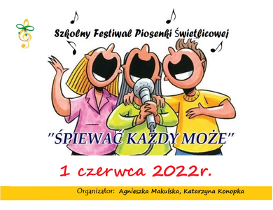 Zapraszamy dzieci z przedszkola, oddziałów przedszkolnych oraz uczniów klas I-III do udziału w Szkolnym Festiwalu Piosenki Świetlicowej, który odbędzie się 1 czerwca 2022r. o godz. 9.00. Szczegółowe informacje w Regulaminie. Uczestników prosimy o wypełnienie karty zgłoszeniowej i przekazanie jej do wychowawców w terminie do 27 maja br.