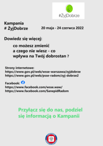 #Żyj Dobrze. To hasło przewodnie kampanii prozdrowotnej, inspirującej Polki i Polaków do wprowadzania zmian na lepsze w swoim życiu po pandemii koronawirusa. Celem głównym kampanii jest przypomnienie, że wyborów wpływających na nasze życie dokonujemy każdego dnia. Chcemy uwrażliwić odbiorców naszych treści na potrzebę stałego identyfikowania swoich problemów zdrowotnych i samodzielnego radzenia sobie z wieloma aspektami swojego życia. Uczyć podejmowania dobrych wyborów i decyzji sprzyjających zdrowiu. Chcemy kształtować zachowania i postawy sprzyjające poprawie zdrowia kompleksowo: w sferze fizycznej, psychicznej czy społecznej.