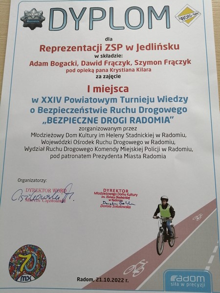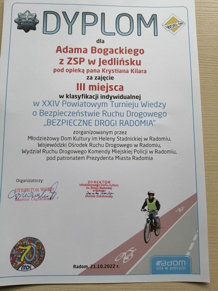 W klasyfikacji końcowej drużyna ZSP w Jedlińsku zajęła I miejsce o otrzymała Puchar Przechodni Prezydenta Miasta Radomia oraz dyplomy i upominki rzeczowe. W gronie 39 uczestników świetnie spisał się Adam, który indywidualnie był trzeci.
