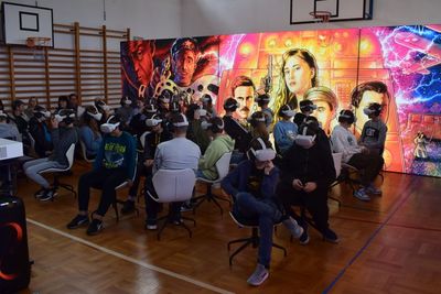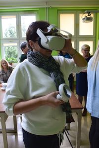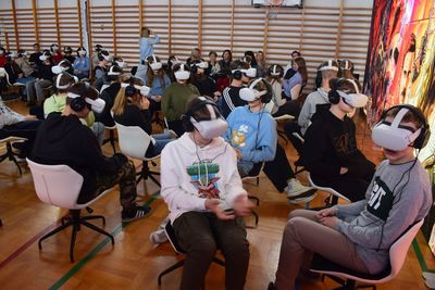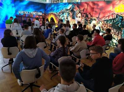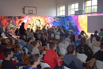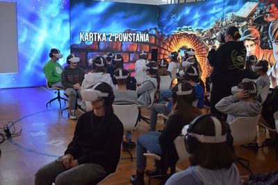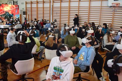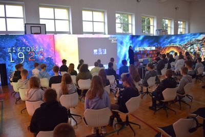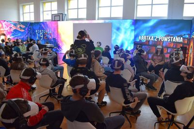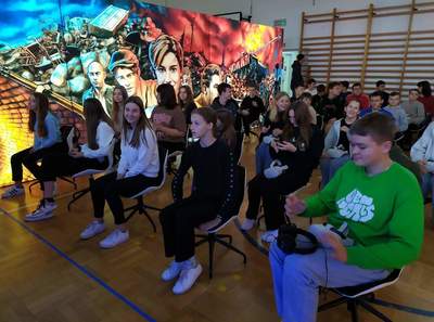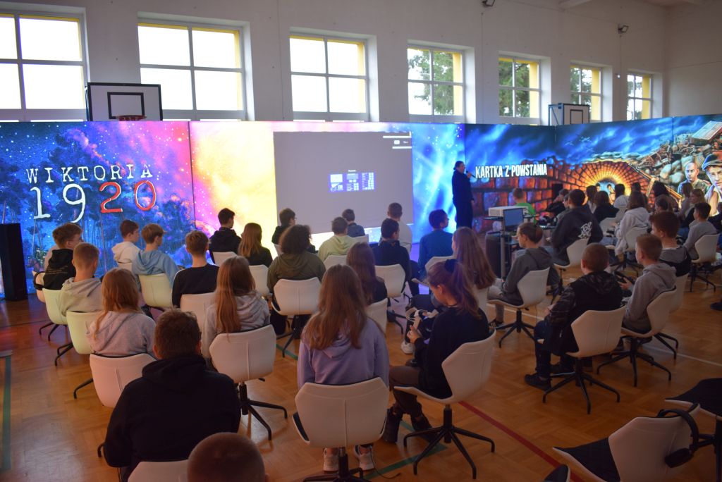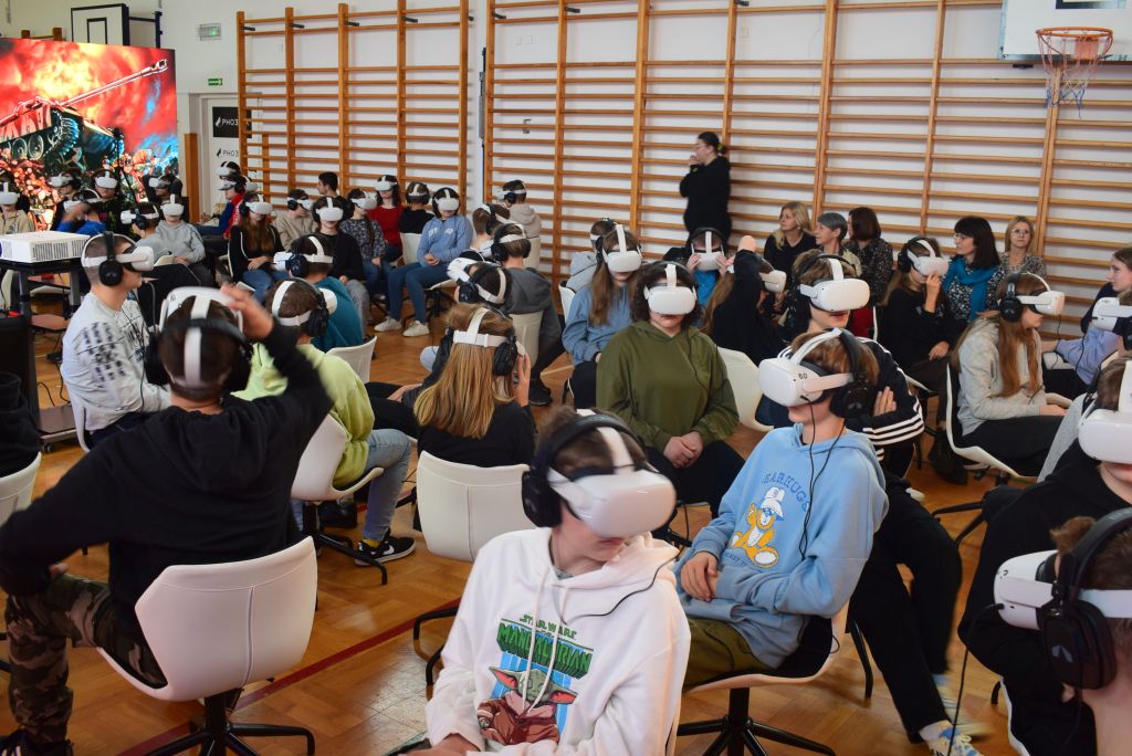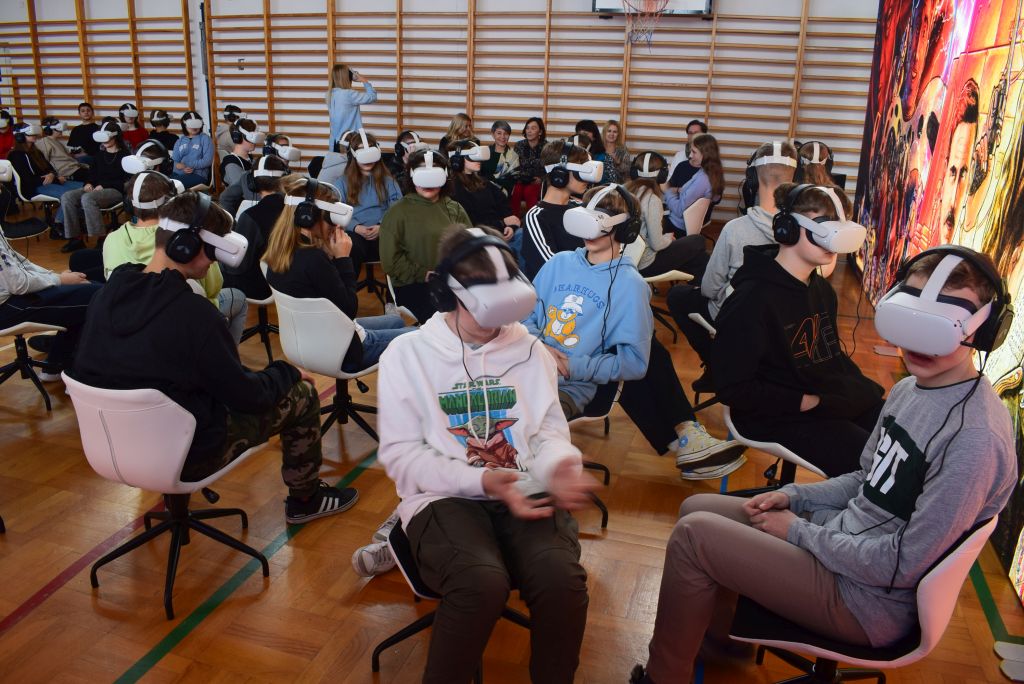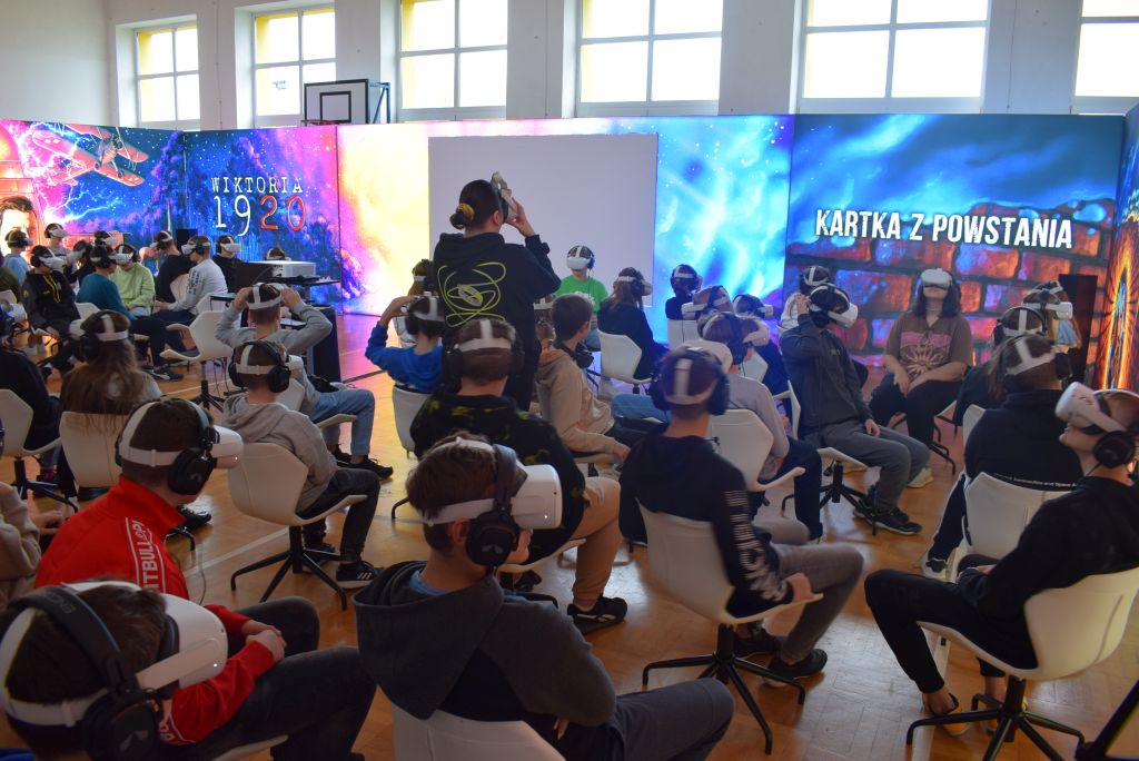 W dniu 2 listopada 2022r. uczniowie klasy 8a i 8b wraz z opiekunami wzięli udział w wyjeździe do Starych Zawad, gdzie w Publicznej Szkole Podstawowej ze swoim projektem „Innowacyjna Historia- nowoczesne technologie w służbie edukacji” gościła fundacja Arte et Marte. Celem projektu jest między innymi rozpowszechnienie nowych technologii jako skutecznych, angażujących narzędzi edukacyjnych oraz podniesienie poziomu wiedzy historycznej wśród młodzieży. Warsztaty dla uczniów składały się z projekcji dwóch filmów historycznych: „Kartka z Powstania” poświęconemu Powstaniu Warszawskiemu1944 oraz „Wiktoria 1920” poświęconemu wojnie polsko-bolszewickiej 1919-1921. Oba seanse odbywały się w technologii Virtual Reality (VR), czyli trójwymiarowej wirtualnej rzeczywistości. Każdy z nich został poprzedzony krótkim wstępem wprowadzającym młodzież w tematykę związaną z filmem. Projekcja filmów odbywała się w sali gimnastycznej gdzie została zbudowana specjalna scenografia przystosowana do pokazu. Uczniowie przy pomocy gogli przenieśli się do Warszawy roku 1920 i 1944. Równolegle z warsztatami dla uczniów odbyła się prezentacja dla nauczycieli, podczas której zostali zapoznani z metodą pracy w wirtualnej rzeczywistości 3D. Serdecznie dziękujemy Publicznej Szkole Podstawowej w Starych Zawadach- koordynatora projektu, za współpracę w jego realizacji.