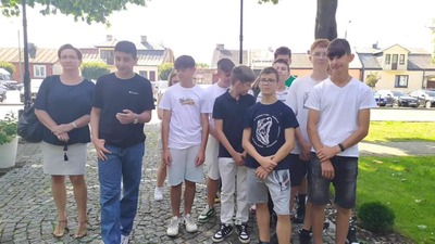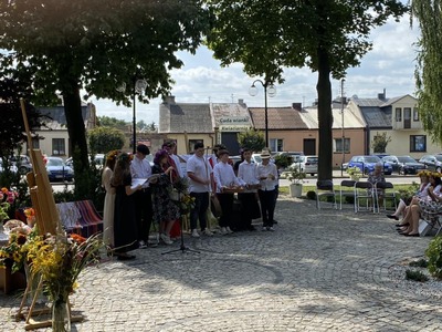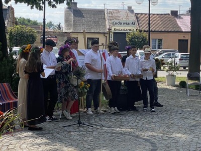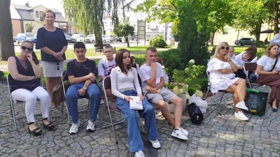 Uczniowie klasy 8a wspólnie z nauczycielami panią Anetą Kacprzak, Justyną Salak, Martą Powęską-Okoń i dyrektorem szkoły Jackiem Tuzinkiem, wicedyrektor Agnieszką Piszak i Anną Jastrzębską uczestniczyli w Narodowym Czytaniu "Nad Niemnem" Elizy Orzeszkowej, zorganizowanym przez Gminną Bibliotekę Publiczną w Jedlińsku dnia 8 września 2023 roku o godzinie 11.00 w parku przy Rynku.