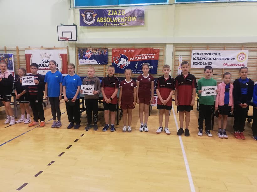 Po 14 szkolnych ekip walczyło w Jeżewie (rejon płocki) w finale wojewódzkim XXVI Mazowieckich Igrzysk Dzieci w tenisie stołowym. Biorąc pod uwagę wiek zawodników ZSP Jedlińsk, start należy uznać za bardzo udany. Nasi czwartoklasiści nie wystraszyli się rywali, którzy w większości byli o dwa lata starsi. Drużyna dziewcząt w pierwszym meczu była wyraźnie stremowana i uległa ekipie z Nowych Łubek 0:3. Z meczu na mecz Maja Małek i Liliana Dębniak „rozkręcały się”. Wygrały dwa spotkania po 3:1. Kolejna wygrana 3:2 z wysoko rozstawioną ekipą z Grodziska Mazowieckiego przyniosła awans do grona sześciu najlepszych drużyn. W pojedynku o awans do pierwszej czwórki przegrały z Nowym Pilczynem 0:3, przegrywając wszystkie gry po 1:2. Mecz z gospodyniami z Jeżewa zakończył się zwycięstwem naszego zespołu 3:2. Wygrana ta zapewniła wysoką, piątą lokatę w całych zawodach. Chłopcy grający w składzie Jan Feruś, Szymon Kowalski i Kacper Bieniek rozpoczęli od wygranej z Siedlcami. Kolejny mecz „planowo” przegrany 0:3 z turniejową jedynką – PSP 17 Radom. Później wygrany 3:0 pojedynek z ekipą z rejonu ciechanowskiego i po zaciętej walce porażka 1:3 z Grodziskiem Mazowieckim. Mecz o siódmą lokatę z Nowymi Łubkami reprezentanci Jedlińska rozstrzygnęli na swoją korzyść 3:2. Zasłużone brawa dla naszych uczniów. We współzawodnictwie szkól zdobyli łącznie (dziewczęta + chłopcy) aż 14 punktów. To duży „zastrzyk” do dorobku sportowego szkoły w bieżącym roku.