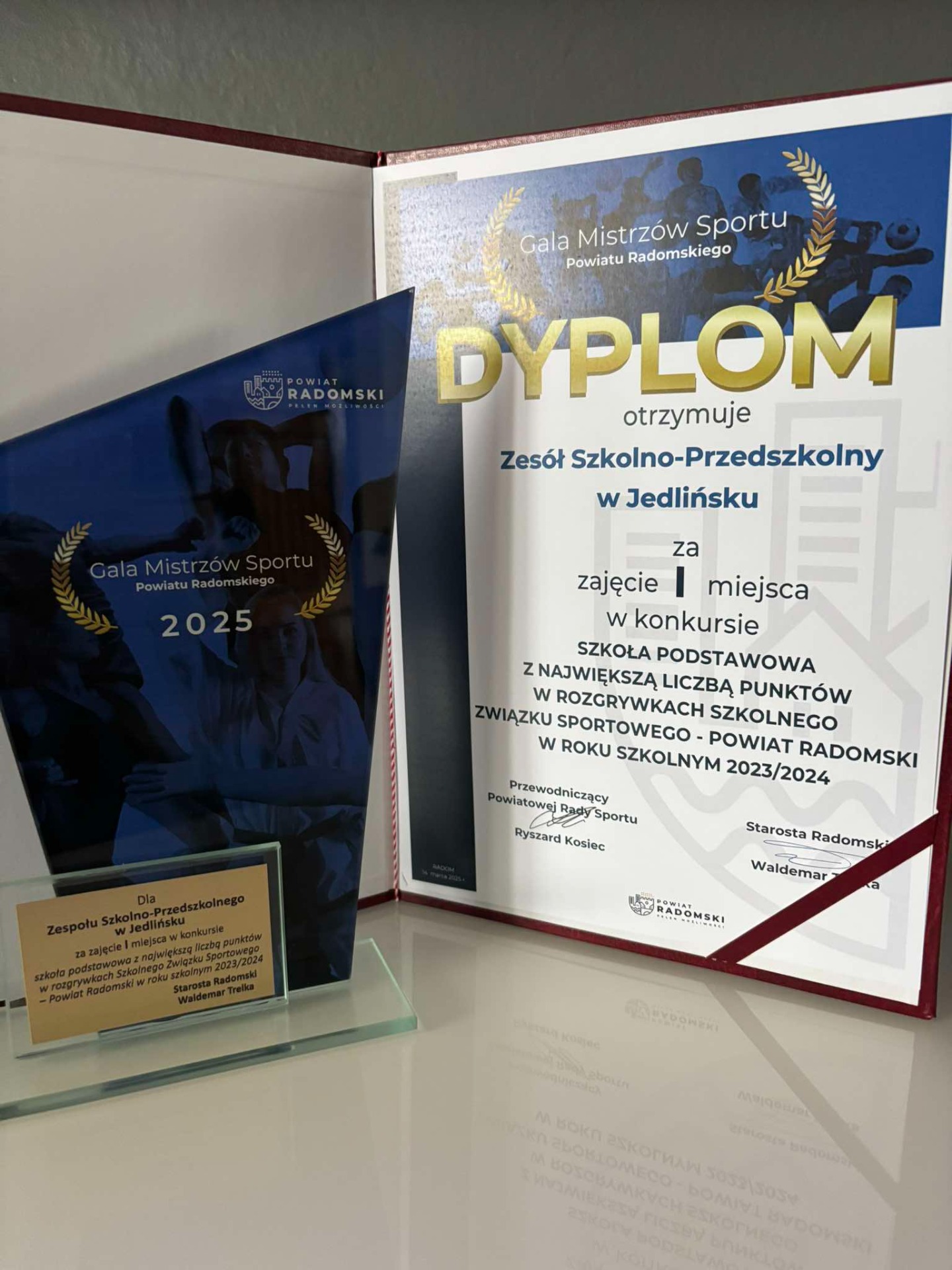 W sali koncertowej Zespołu Szkół Muzycznych w Radomiu, nagrodzono najlepszych sportowców w powiecie radomskim za ich dokonania w roku 2024. Wśród nich, wystąpiło dziewięcioro uczniów ZSP w Jedlińsku. nominowanych z terenu gminy Jedlińsk. w dwóch kategoriach wiekowych. Laureatem 𝟏𝟔. 𝐆𝐚𝐥𝐢 𝐌𝐢𝐬𝐭𝐫𝐳ó𝐰 𝐒𝐩𝐨𝐫𝐭𝐮 𝐏𝐨𝐰𝐢𝐚𝐭𝐮 𝐑𝐚𝐝𝐨𝐦𝐬𝐤𝐢𝐞𝐠𝐨 został 𝐌𝐚𝐜𝐢𝐞𝐣 𝐊𝐚𝐫𝐚𝐬𝐞𝐤, któremu przyznano pierwsze miejsce. Wyróżnienie odebrał 𝐃𝐨𝐦𝐢𝐧𝐢𝐤 𝐆𝐫𝐚𝐛𝐨𝐰𝐬𝐤𝐢. Obaj otrzymali nagrody i okolicznościowe statuetki. Upominkami nagrodzono pozostałych nominowanych: 𝐍𝐢𝐤𝐨𝐥ę 𝐁𝐞𝐥𝐢𝐜ę, 𝐉𝐮𝐥𝐢ę 𝐁𝐮𝐤𝐨𝐰𝐬𝐤ą, 𝐃𝐚𝐰𝐢𝐝𝐚 𝐁𝐫𝐳𝐞𝐳𝐢ń𝐬𝐤𝐢𝐞𝐠𝐨, 𝐓𝐲𝐦𝐨𝐭𝐞𝐮𝐬𝐳𝐚 𝐌𝐚𝐤𝐮𝐥𝐬𝐤𝐢𝐞𝐠𝐨, 𝐀𝐧𝐭𝐨𝐧𝐢𝐞𝐠𝐨 𝐏𝐢𝐰𝐨𝐰𝐚𝐫𝐜𝐳𝐲𝐤𝐚, 𝐊𝐚𝐜𝐩𝐫𝐚 𝐁𝐢𝐞ń𝐤𝐚 𝐨𝐫𝐚𝐳 𝐖𝐨𝐣𝐜𝐢𝐞𝐜𝐡𝐚 𝐓𝐚𝐫𝐧𝐨𝐰𝐬𝐤𝐢𝐞𝐠𝐨. Ten ostatni reprezentował 𝗚𝗞𝗦 𝗗𝗿𝗼𝗴𝗼𝘄𝗶𝗲𝗰 𝗝𝗲𝗱𝗹𝗶ń𝘀𝗸 za osiągnięcia w klubowej piłce nożnej. Przypomnijmy, że nasi wyróżnieni sportowcy osiągali sukcesy na szczeblu ogólnopolskim i wojewódzkim w biegach przełajowych, lekkiej atletyce, tenisie stołowym i unihokeju. Dodajmy, że kapitułę przyznającą wyróżnienia tworzą członkowie Powiatowej Rady Sportu, po jednej osobie z każdej gminy powiatu radomskiego. Jedlińsk reprezentuje 𝗥𝗼𝗺𝗮𝗻 𝗪ó𝗷𝗰𝗶𝗸, dyrektor PSP w Starych Zawadach, radny powiatu radomskiego. Wyróżniono także trzy najlepsze szkoły w sportowym współzawodnictwie na szczeblu powiatu. Podobnie jak przed rokiem, wygrał ZSP Jedlińsk, przed SP z Iłży i PSP z Przytyka. Puchar za 1. miejsce odebrał 𝐉𝐚𝐜𝐞𝐤 𝐓𝐮𝐳𝐢𝐧𝐞𝐤 – dyrektor Zespołu Szkolno - Przedszkolnego w Jedlińsku. W gronie trenerów i nauczycieli okolicznościową statuetką uhonorowano 𝗞𝗿𝘆𝘀𝘁𝗶𝗮𝗻𝗮 𝗞𝗶𝗹𝗮𝗿𝗮 – nauczyciela wychowania fizycznego ZSP w Jedlińsku. Gościem specjalnym imprezy był Paweł Nastula – złoty medalista olimpiady w Atlancie z 1996r. w judo Całość imprezy uświetniły występy muzyczne oraz pokaz w wykonaniu sekcji judo ULKS Kowala. Wielkie gratulacje dla naszych sportowców! Tak trzymać!