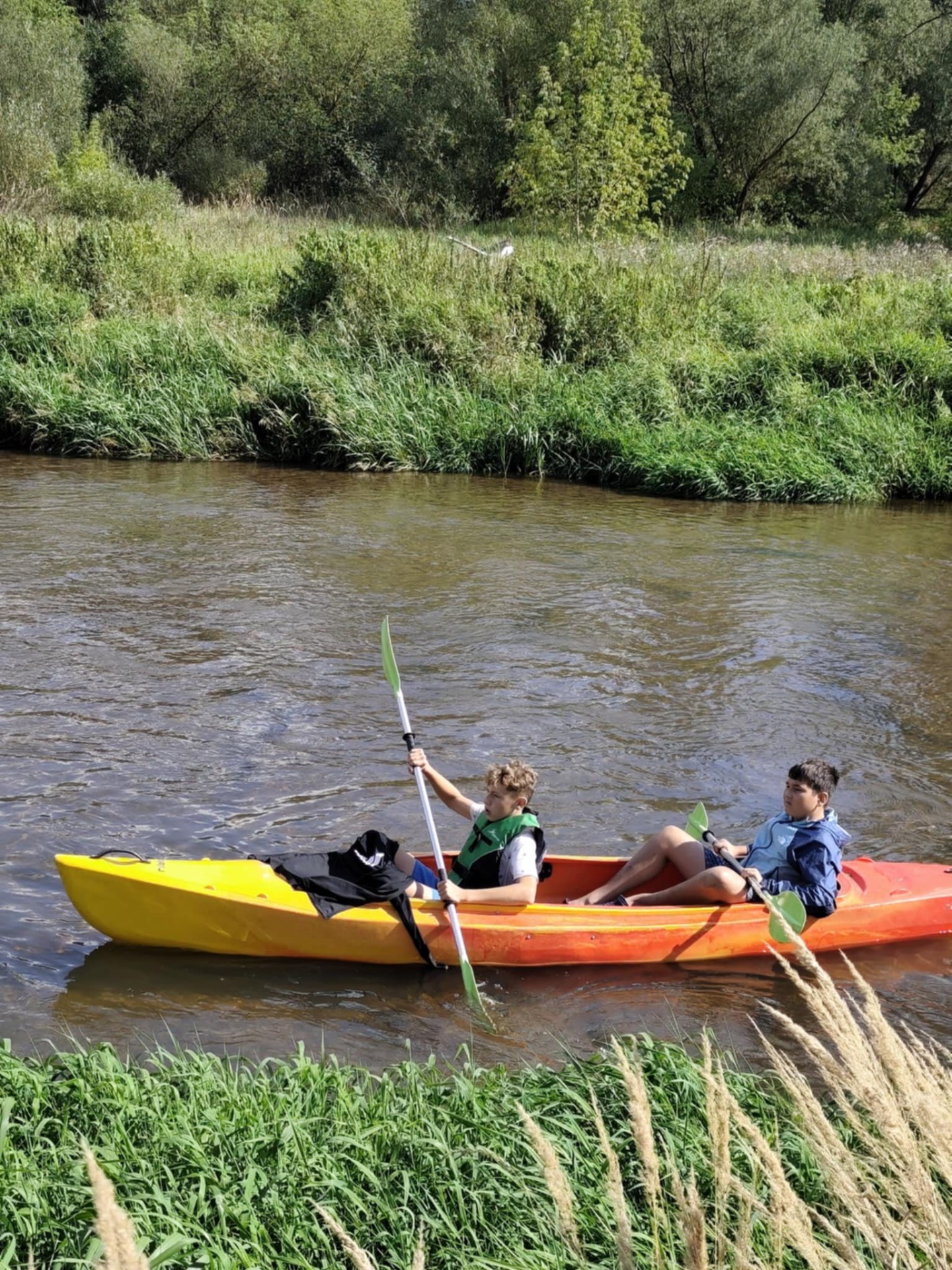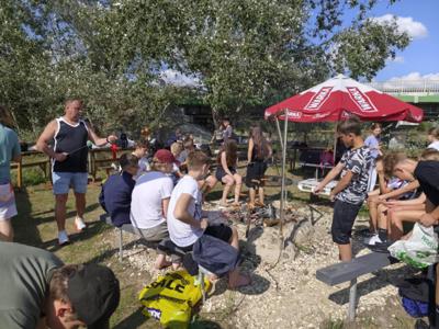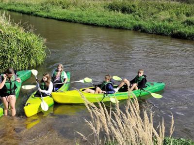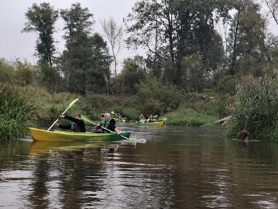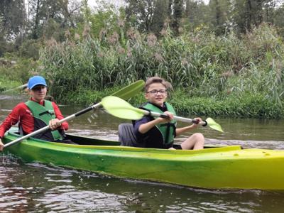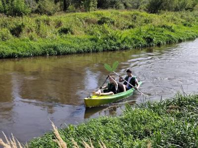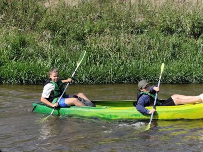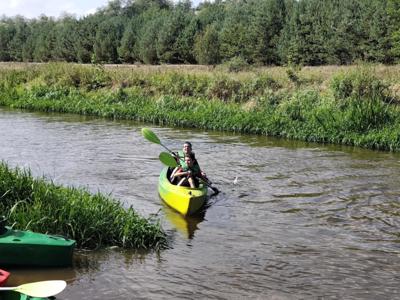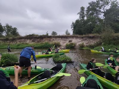 W środę 10 wrzesnia 2025r. uczniowie klasy 7a i 7b wyruszyli na niezwykłą przygodę -spływ kajakowy. Towarzyszyli im opiekunowie oraz ratownik, którzy czuwali nad bezpieczeństwem młodych uczestników. Punktem startowym była Brzóza. To właśnie tam wszyscy zapoznali się z zasadami zachowania się na wodzie, by spływ przebiegał spokojnie i bezpiecznie. Po krótkim instruktażu uczniowie zajęli miejsca w dwuosobowych kajakach. Początkowo poranek był rześki, ale słońce dosyć szybko wyłoniło się zza chmur, sprawiając, że dzień stał się piękny i ciepły. Wiosła zanurzały się w wodzie, a rzeka niosła młodych kajakarzy w stronę przygody. Z perspektywy kajaka mogli podziwiać piękne uroki przyrody, jakie oferowała Radomka. Śmiech, radość i wspólna rywalizacja o to, kto szybciej dopłynie do kolejnego zakrętu, sprawiały, że spływ był niezapomnianym przeżyciem. Po pokonaniu 14 km grupa dotarła do mety w Ryczywole. Tam czekało na wszystkich ognisko i pieczone kiełbaski. Opiekunowie: Radosław Ofiara, Iwona Wąsik-Zębik, Sławomir Słomka i Błażej Makulski-z uznaniem obserwowali swoich podopiecznych. Podziwiali ich pomysłowość, współpracę i technikę, dzięki którym poradził sobie z kajakarskim wyzwaniem. Ten dzień na długo pozostanie w pamięci uczniów -jako czas przygody, wspólnej zabawy i pięknych chwil spędzonych na łonie natury