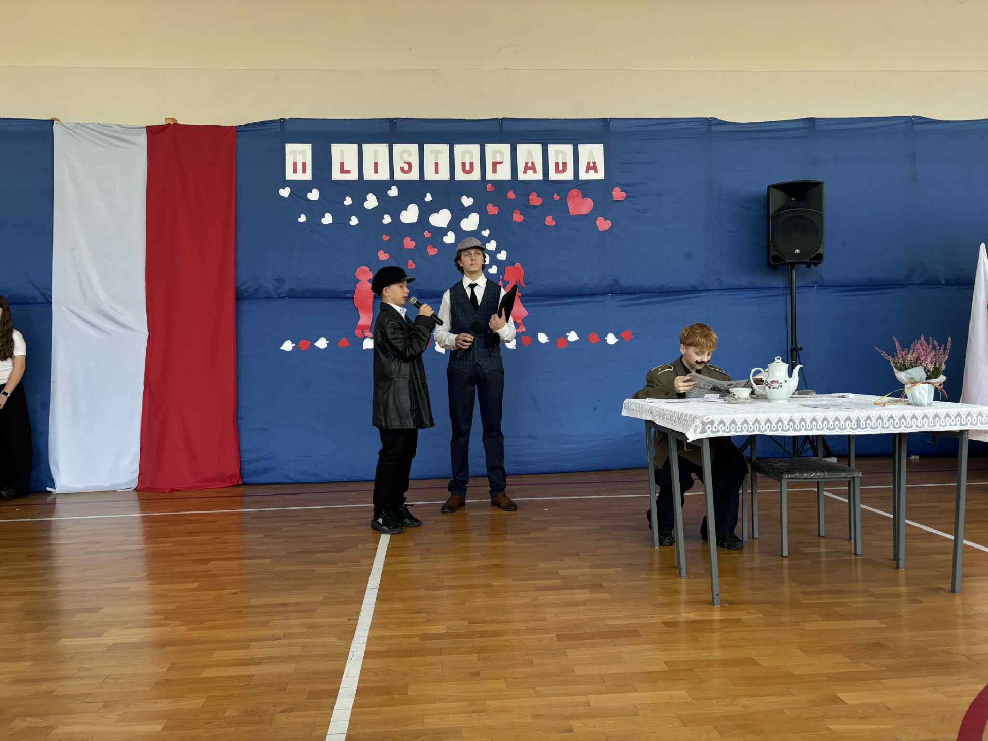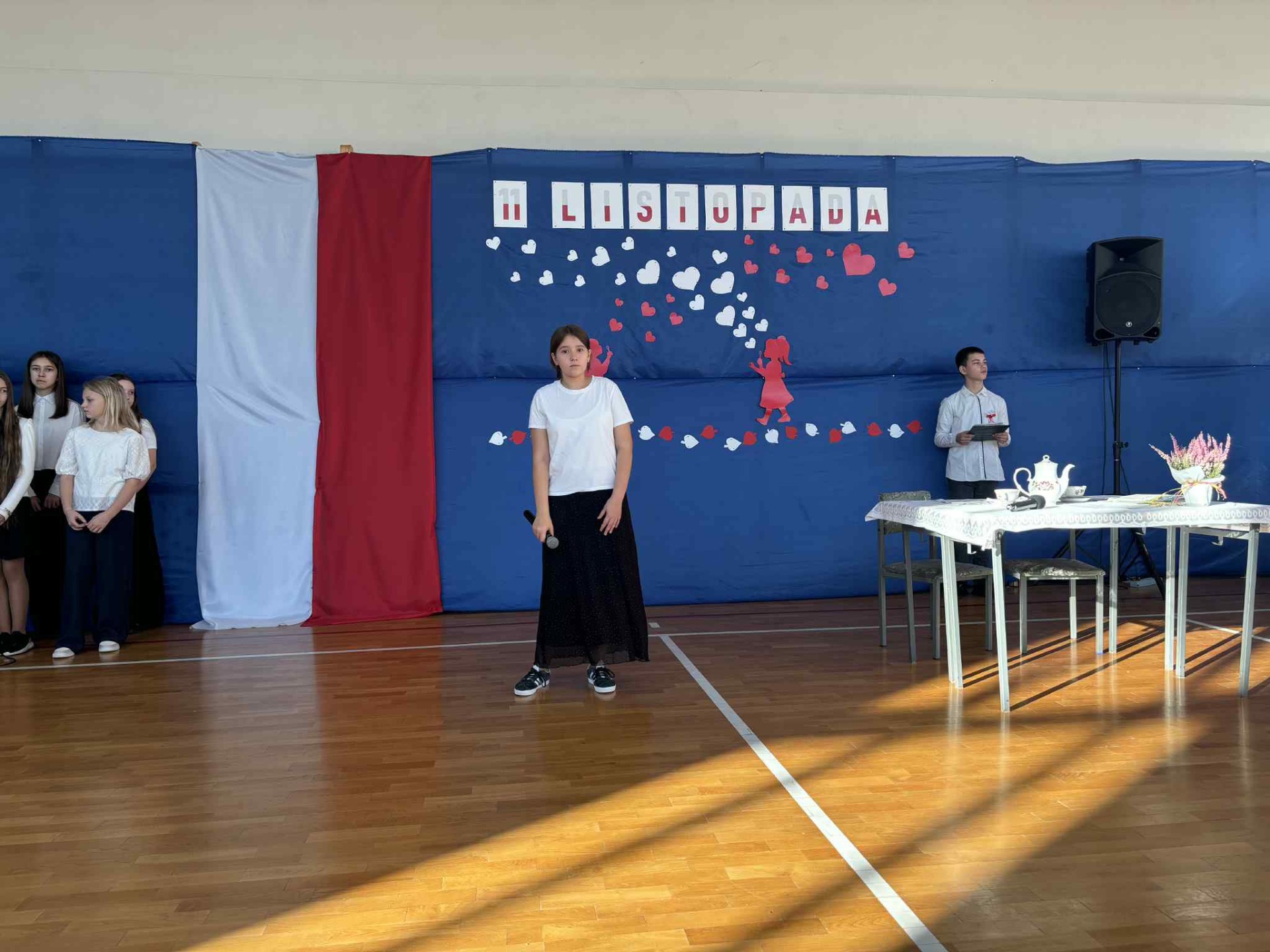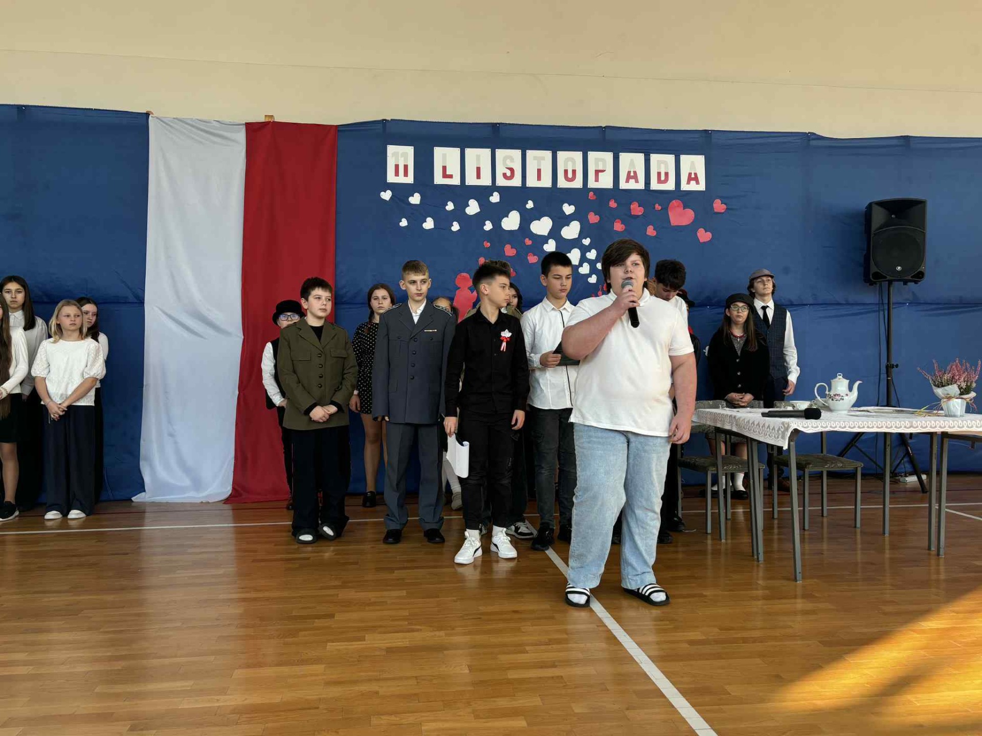 W naszej szkole odbyła się akademia nawiązująca do nadchodzącego Narodowego Święta Niepodległości, upamiętniająca kolejną rocznicę odzyskania upragnionej wolności. W wydarzeniu wzięli udział: dyrekcja, nauczyciele oraz wszyscy uczniowie. W programie słowno- muzycznym uczestniczyły chętne dzieci z klas: 3b, 6a, 6c i 7c. Grupa z dużą świadomością i zaangażowaniem przybliżyła koleżankom oraz kolegom ważne losy Ojczyzny, które zapisane zostały na kartach historii i o których należy pamiętać. Działo się to na tle wymownej, biało- czerwonej dekoracji, która została dopełniona symbolicznymi elementami scenografii. Osoby występujące w przedstawieniu wcieliły się m.in. w Józefa Piłsudskiego, Romana Dmowskiego, Ignacego Daszyńskiego, Ignacego Paderewskiego oraz Wincentego Witosa, którzy nie bez powodu nazywani są Ojcami Niepodległości. Ich zasługi dla suwerenności naszego kraju są znaczące. Występ uczniów rozpoczęło wspólne odśpiewanie hymnu. W dalszej części nie zabrakło szeregu faktów, recytacji czy dialogów w poszczególnych scenkach. Całość została pięknie podkreślona utworami muzycznymi. Wśród nich znalazły się zarówno tradycyjne pieśni, jak i współczesne piosenki patriotyczne, śpiewane przez solistki oraz szkolny chórek. Akademia zakończyła się krótkim przemówieniem pana Dyrektora, który podziękował za lekcję historii, podkreślił rangę nadchodzącego święta i zaapelował do wszystkich o patriotyczną postawę w atmosferze szacunku.